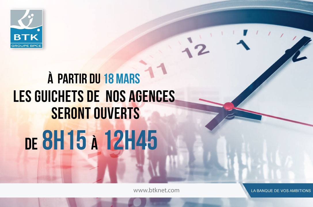 Nous informons notre aimable clientèle, que toutes nos agences seront ouvertes à partir du Mercredi 18 Mars de 08h15 à 12h45....